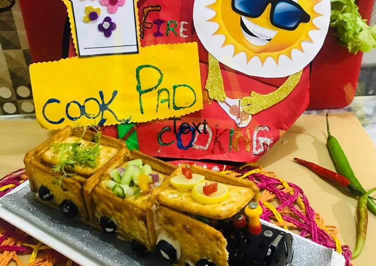 - Now open the tuc biscuits add mayonnaise in a bowl and take paste the mayo each tuc biscuits upto 4 sides and attach the train like this way, then add any toy train..